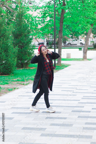 A young woman with long hair and a red hat wearing glasses and dark coat with a red scarf in the park walking against trees on a pedestrian road.