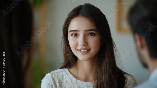 A young woman with long hair is smiling while talking with two friends in a warm environment