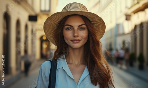 A young woman with long hair wearing a straw hat, smiling in a sunny street.