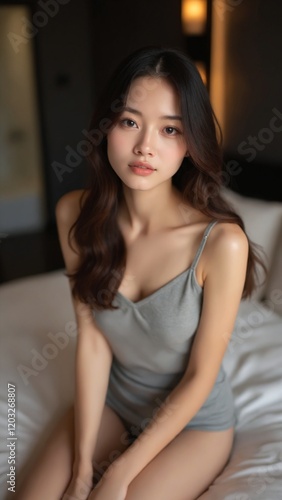 A young woman with long, straight dark brown hair, parted in the middle, sits on a bed