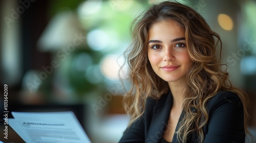 A young woman with wavy hair sitting at a table, reviewing documents with a smile.