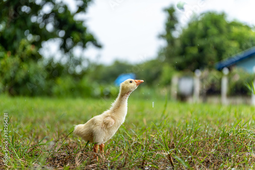 A young yellow gosling walks on the grass .