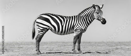 A zebra stands gracefully on the open plain, its striking black and white stripes creating a mesmerizing contrast against the landscape.