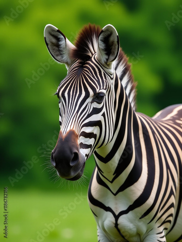 A Zebra Stands Out Starkly Against A Vibrant Green Blurred Foliage Background With Its Distinctive Black And White Stripes Prominent. 00002