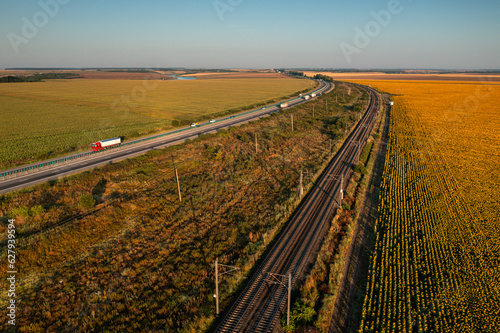 A2 highway in Romania. Aerial photo with motorway road from Bucharest to Constanta during a beautiful summer sunrise. High speed infrastructure industry.