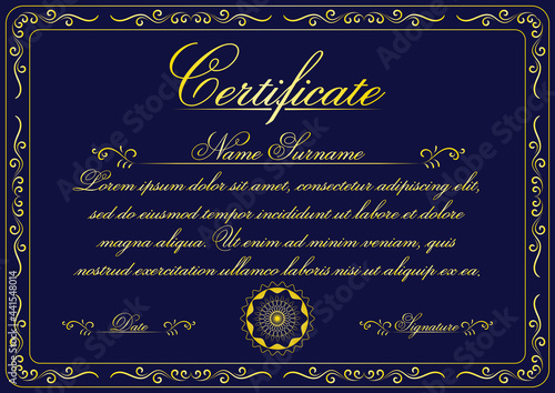 A4 size golde vintage certificate vector design with hand drawn flourish swirl frame. Vintage diploma border frame template illustration to use in invitation, card, calligraphy, retro design projects.