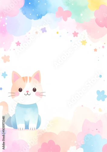 A4-sized paper templates with adorable cartoon cat designs. Each page features a different layout with soft pastel colors, cute illustrations of cats, and playful borders, perfect for children's