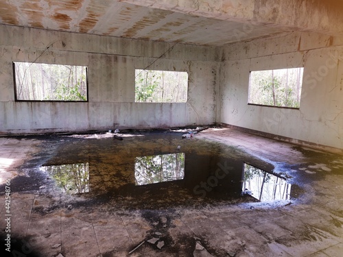 abandoned building Abandoned room with cracked walls and peeling paint There is water inside the horror.