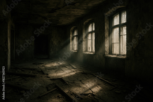 Abandoned building interior with cracked walls broken floor and dusty sunlight through windows eerie atmosphere creates mysterious and haunting mood in dark room