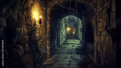 Abandoned castle corridor at night. Vector cartoon illustration of spooky hall in medieval royal palace with broken tiles on floor, dusty cobweb and empty torches on stone walls, scary dark hallway