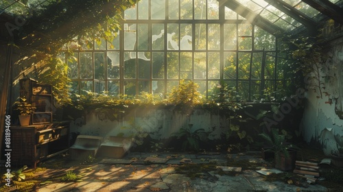 Abandoned Greenhouse with Sunlight and Overgrown Vegetation