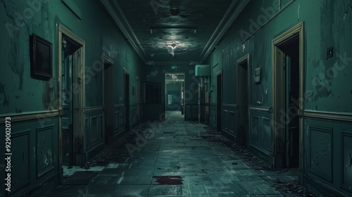 Abandoned hallway in an old building, with peeling paint and debris on the floor