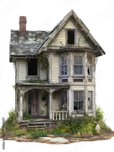 Abandoned house isolate on white background, dilapidated structure,