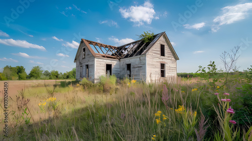Abandoned house with a damaged roof, surrounded by tall grass and wildflowers under a blue sky, showcasing nature reclaiming space.