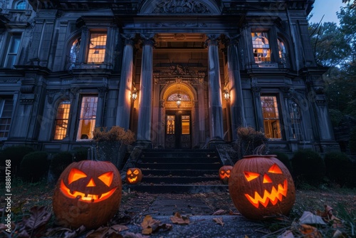 Abandoned mansion with jack-o'-lanterns illuminating the entrance, phantoms visible through broken windows, night scene