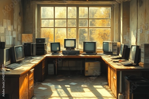 Abandoned Office with Vintage Computers and Sunlit Windows