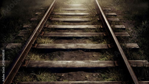 Abandoned railroad track in fog, overgrown grass and broken wood, Great Depression metaphor, lost direction.