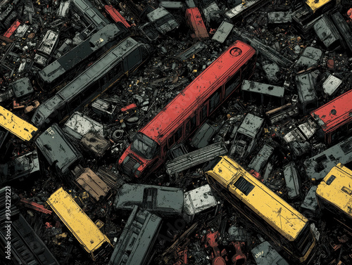 Abandoned railway yard filled with discarded trains in various colors and orientations, showcasing the remnants of an industrial era