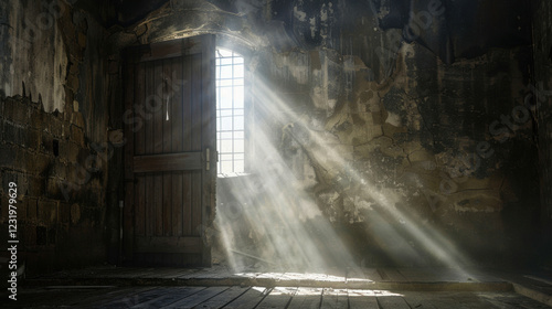 Abandoned room with sunlight streaming through door, creating dramatic atmosphere. walls show signs of decay, enhancing eerie feeling of space