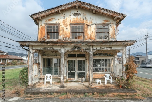 Abandoned two-story Japanese house in the suburbs, with peeling paint, closed windows, and white plastic chairs on the front yard. Panoramic view of dilapidated structure under bright daylight.