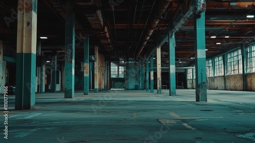 Abandoned warehouse interior with high ceilings and industrial beams showcasing vast empty space and large windows for natural light