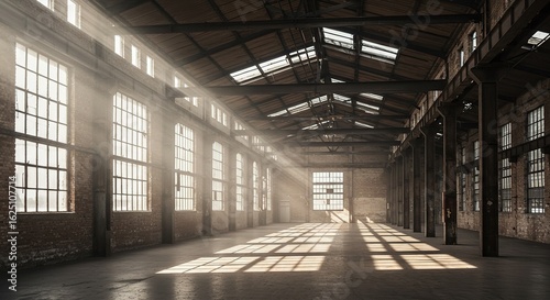 Abandoned warehouse interior with sunlight streaming through windows and industrial architecture design