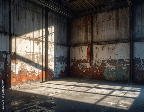 Abandoned Warehouse Interior with Weathered Walls and Sunlight Beams