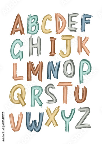 ABC alphabet poster design with multicolored raised letters isolated on white background in modern flat style.