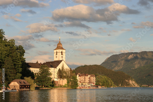 Abendstimmung am Wolfgangsee; Blick zur Pfarr-und Pilgerkirche in St. Wolfgang