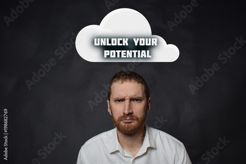 Above the businessman hangs a cloud with the inscription:UNLOCK YOUR POTENTIAL