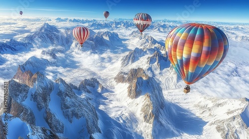 Above the Clouds Colorful Hot Air Balloons Flying Over Snowy Mountain Peaks Winter Landscape Adventure Journey Scenery