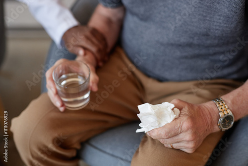 Above view close up of senior male patient holding glass of water and tissue during difficult consultation in clinic with doctor comforting him, copy space