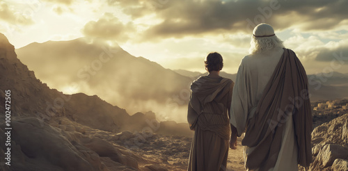 Abraham and his son from the Bible walking towards the top of a mountain back view
