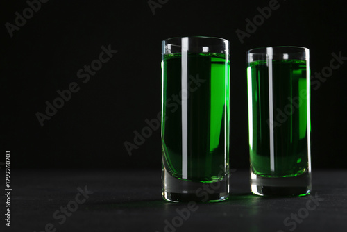 Absinthe in shot glasses on table against black background, closeup. Space for text