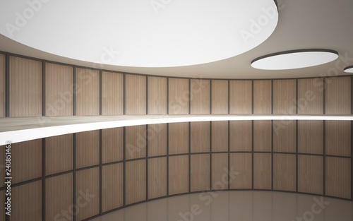 Abstract concrete and wood interior multilevel public space with neon lighting. 3D illustration and rendering.