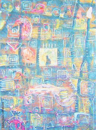 Abstract painting with window and silhouette. Art abstract painted background in turquoise, orange, yellow and blue colors.