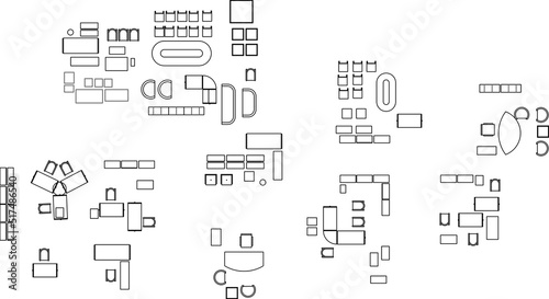 Abstract 2d illustration of office furnitures. Technical plan drawing of tables, chairs and cabinets.