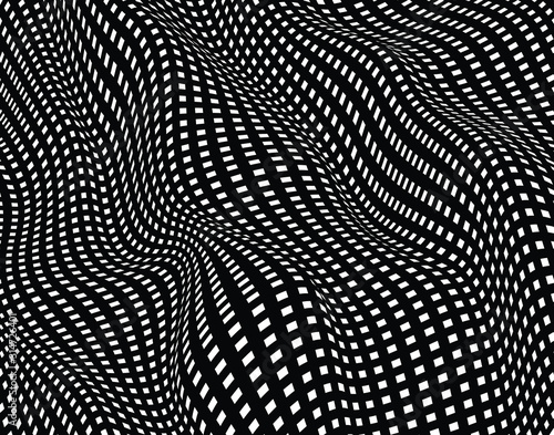 Abstract 3d background with optical illusion wave. Black and white horizontal lines with wavy distortion effect for prints, web pages, template, posters, monochrome backgrounds and pattern