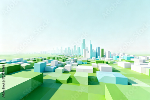Abstract 3D cityscape with geometric buildings and green terrain under a clear sky