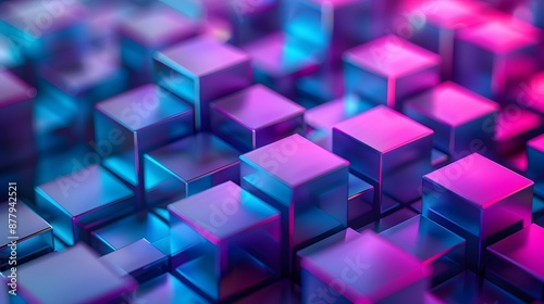 Abstract 3D cubes with glowing pink and blue lights, creating a futuristic and vibrant digital artwork. Ideal for tech and design concepts.