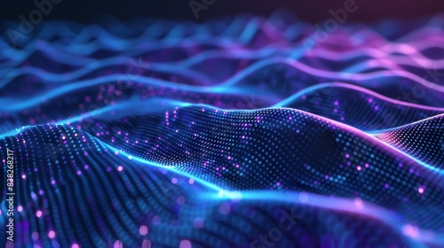 Abstract 3D digital technology background. A futuristic sci-fi user interface with gradient dots and lines. Big data, artificial intelligence, music hud. Blockchain and cryptocurrency.