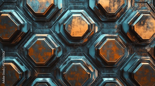 Abstract 3D geometric background of octagonal shapes in blue and orange.