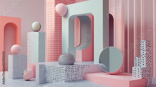 Abstract 3D geometric shapes composition, pastel colors, minimalist background. Possible use in design, fashion, or digital art projects