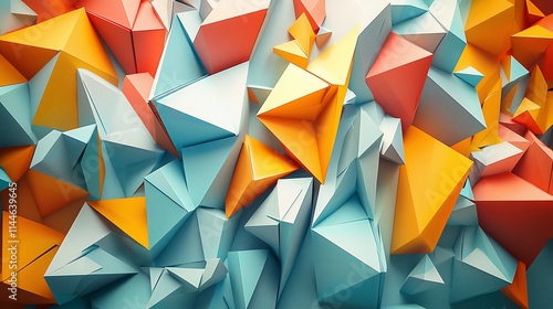 Abstract 3D polygonal background with orange, yellow, and blue geometric shapes.