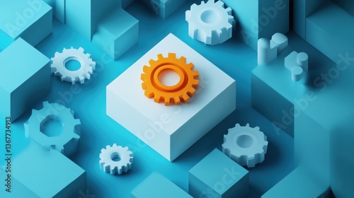 Abstract 3D Render: Orange Gear on White Cube Amongst Blue Geometric Shapes and Gears