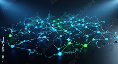 Abstract 3D rendering of interconnected nodes, glowing on a dark blue surface