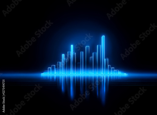 Abstract: Abstract blue glowing cityscape silhouette against dark background with a reflective surface.