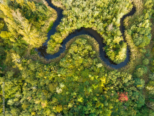 Abstract aerial top view of winding river Aa in forest, Starkriet, Someren-Eind, Noord-Brabant, Netherlands.
