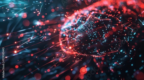 Abstract AI concept with a glowing brain connected to digital networks and data streams.