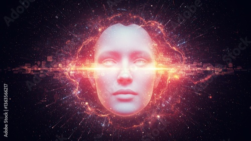 Abstract AI face with glowing energy beams, digital art, dark background.